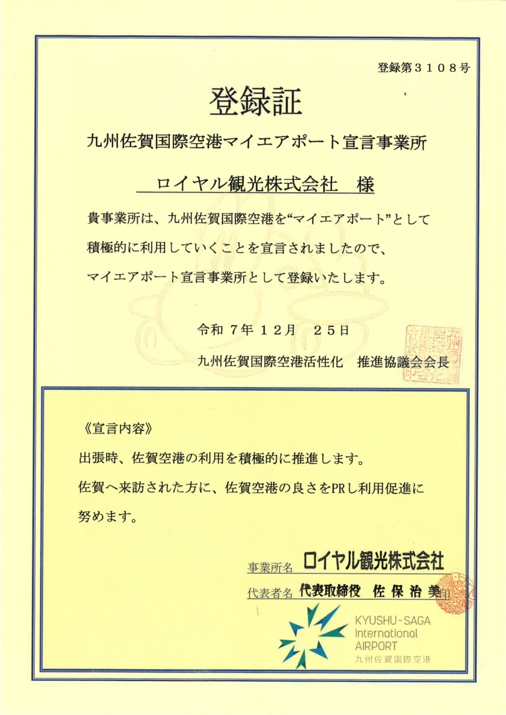 NEWS お知らせ HOMENEWS九州佐賀国際空港マイエアポート宣言のお知らせ 九州佐賀国際空港マイエアポート宣言のお知らせ 2026.01.20 この度、九州佐賀国際空港マイエアポート宣言を登録いたしました。当社は積極的な佐賀空港利用を推進いたします。